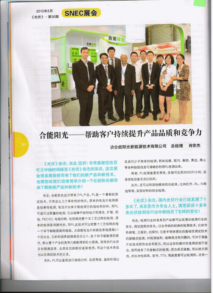 肖總:合能陽光這次帶來了PL產(chǎn)品,PL是一個最新的測試技術(shù)。它有這么幾個革命性的特點(diǎn):原來的電池片檢測都是結(jié)果性檢測,電池片出來才能檢測它的指標(biāo)和好壞,而PL可進(jìn)行過程量的檢測,它從硅棒開始到硅片到清洗、擴(kuò)散、刻蝕、PECVD、電極印刷、包括燒結(jié)整個全工藝過程的檢測。原來的檢測是局限性的,而PL這技術(shù)可以把整個工藝制程的每一個環(huán)節(jié)都能提高到極致。太陽能電池片轉(zhuǎn)換效率每提高0.1個百分點(diǎn),它的利潤率就提高百分之十,各個環(huán)節(jié)都能得到提升,那么整個產(chǎn)業(yè)的競爭力都能得到巨大提高?,F(xiàn)有的行業(yè)狀況對提高效率、品質(zhì)在后面都在逐漸使用,而這個技術(shù)將成為以后測試技術(shù)的主流。